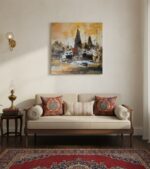 The artist utilizes knife work to achieve a textural, impressionistic feel, particularly in the depiction of the water and the architectural facades. Subtle figures ascend and descend the central steps, adding a vital sense of life and pilgrimage to the scene. This compact piece is an excellent choice for a collector who values cultural themes, dramatic lighting, and textural depth in a work of art.