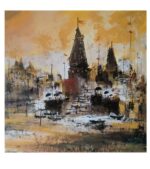 Holy Steps at Dusk is a visually arresting and emotionally rich piece, rendered in acrylic on paper. This artwork captures the timeless scene of a riverside ghat, focusing on the imposing temple architecture and the movement of people.