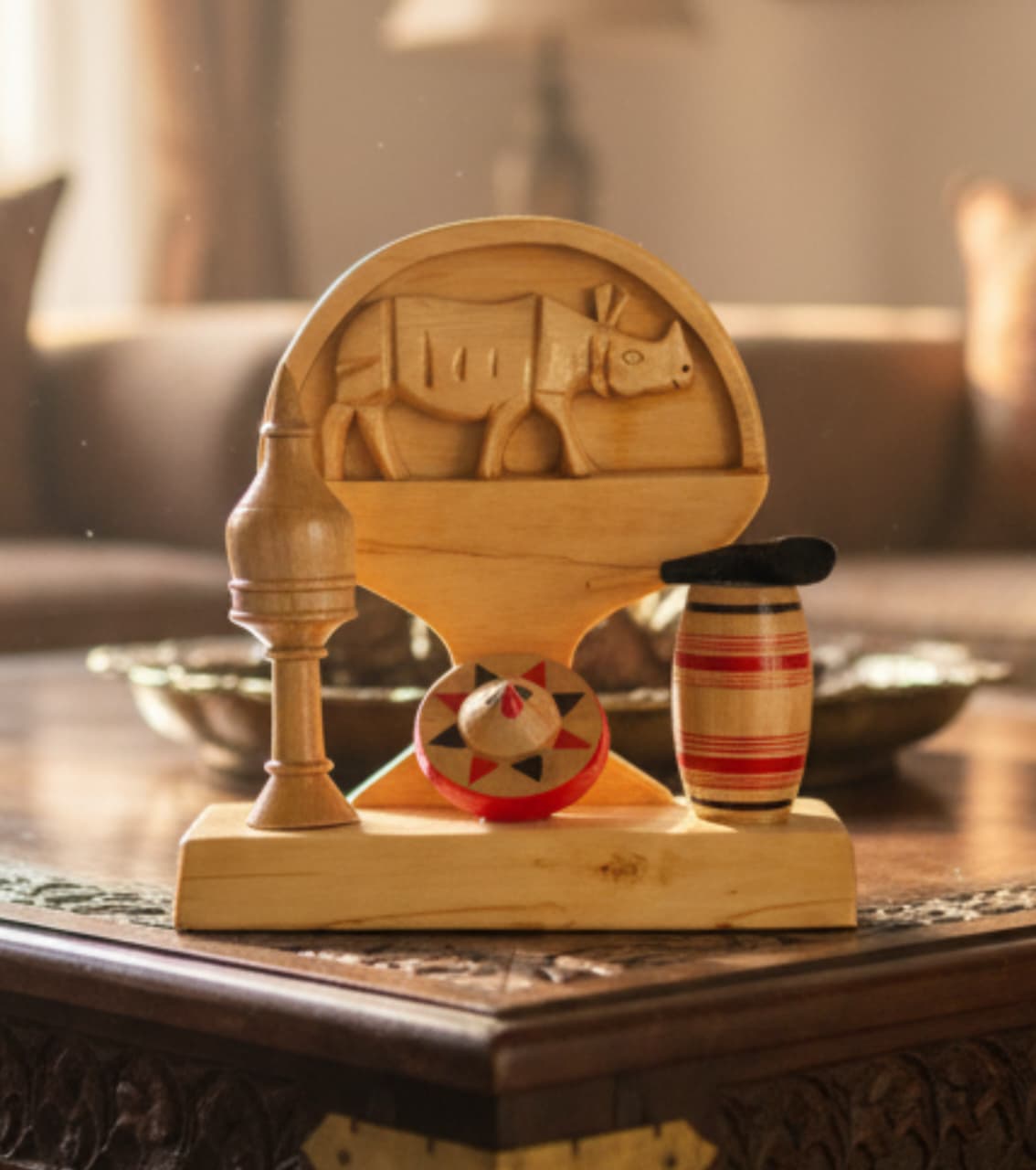 Assam traditional wooden memento, handcrafted Assamese decor, Assamese cultural gift, wooden Assamese showpiece, Kaziranga rhino souvenir, Assamese handicraft décor, Jaapi Pepa Dhol Xorai art, Assamese wooden sculpture, handmade gift from Assam, Assamese traditional souvenir