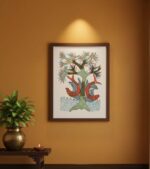 This specific piece beautifully depicts two graceful deer interacting beneath a lush, stylized Tree of Life. The imagery of deer, often symbolizing gentleness, and the tree, representing creation and sustenance, are central to Gond art, reflecting the tribe’s deep spiritual connection to their environment. Observe the intricate “signature patterns”—the fine lines, dots, and dashes—that meticulously fill the bodies of the deer and the foliage, giving them a distinct texture and sense of movement. The bold colors, particularly the deep greens and browns, bring an arresting, vivid energy to the artwork. This painting is a unique, one-of-a-kind representation of harmony and natural balance, making it a perfect focal point for your living room decor or office wall art.