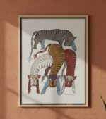 Handmade 11×15 inch authentic Gond painting of Four Stylized Tigers. This vibrant Indian folk art, rich in history and tribal lore, is a genuine, unframed cultural masterpiece priced at ₹3000. Perfect for art lovers seeking unique, high-quality Indian wall decor. For custom framing, WhatsApp us at +91 81003 84587.