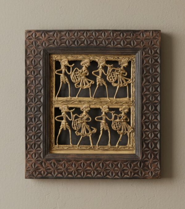 Material : Features a central Dokra brass set within a dark, possibly carved wooden frame