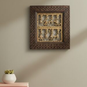 Material: Features a central Dokra brass set within a dark, possibly carved wooden frame