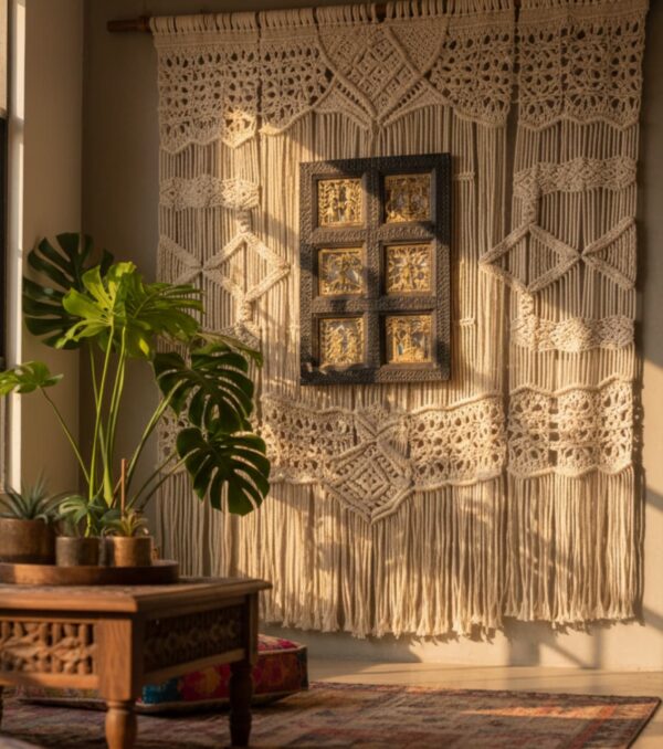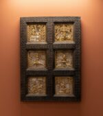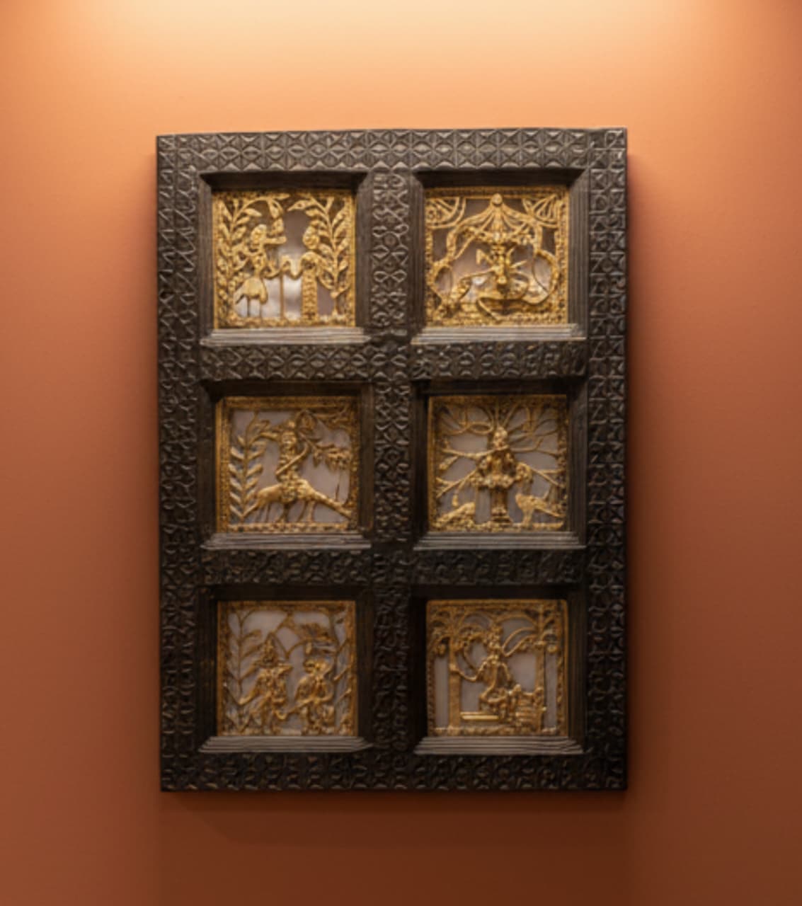 Material : Features a central Dokra brass set within a dark, possibly carved wooden frame