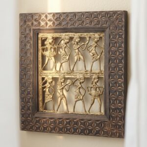 Material : Features a central Dokra brass set within a dark, possibly carved wooden frame