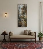 The artist masterfully uses knife work to build a highly impasto and expressive surface. The vertical orientation (20″ x 10″) enhances the feeling of height and depth, while the broken, reflective strokes in the lower half brilliantly capture the appearance of moving water. This piece is a powerful choice for those who appreciate moody, textural landscapes and the quiet drama of the changing seasons.