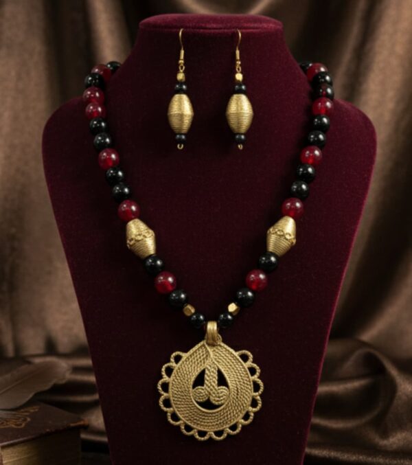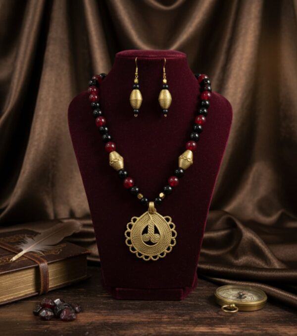 Vibrant Beadwork: The necklace features a rich combination of smooth Red and deep Black beads, creating a dramatic and elegant color contrast that makes the golden Dokra elements pop. Smaller metallic beads are interspersed to enhance the brilliance.