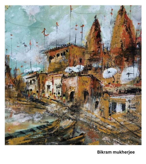 Ghats of the Divine City is a captivating semi-abstract landscape, painted with acrylic on paper. The piece vividly captures the atmosphere of a sacred riverside city, likely Varanasi, seen from the water.