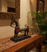 Elevate your living space with this Handmade Brass Dokra Horse, a magnificent embodiment of India’s ancient lost-wax metal casting tradition. Measuring 7 inches in height and 18 inches in width, this art piece showcases remarkable craftsmanship — from the finely etched textures to the traditional tribal motifs that adorn its saddle and body.
