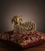 The sculpture depicts Nandi, the sacred bull and devoted companion of Lord Shiva, symbolizing faith, patience, and purity. Its open lattice body design, ornate detailing, and antique brass finish make it both a spiritual icon and a statement décor piece.