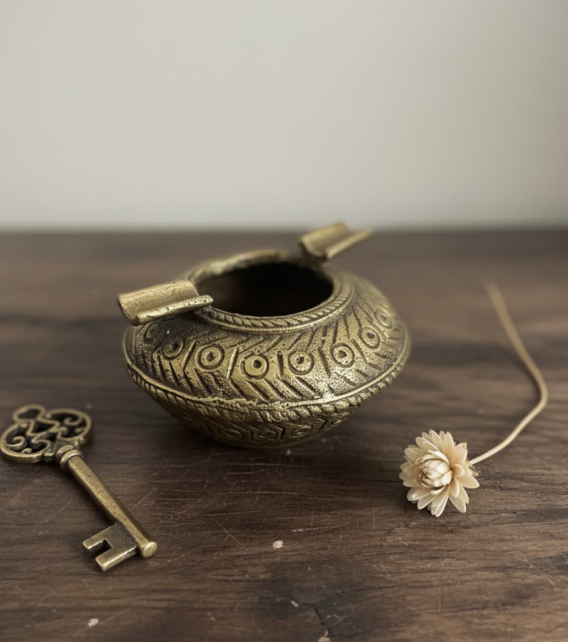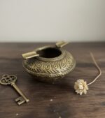 Each ashtray is individually handcrafted by skilled artisans using the traditional lost-wax method, ensuring a unique and authentic piece. The design features rich, embossed patterns around its sturdy base, reflecting traditional motifs and the artisanal skill embedded in every curve. The antique brass finish lends a sophisticated, weathered look that complements any refined setting, from a home office to a study or a cozy lounge.