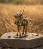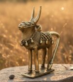 This stunning Dokra bull, with its distinctive textured body and intricate detailing, embodies the rustic charm and spiritual significance often found in indigenous art. The warm, golden hue of the brass is beautifully highlighted against any backdrop, making it a captivating focal point for your living room, study, or office.
