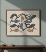 Celebrate the natural world with this gorgeous, authentic handmade Gond painting. Measuring 11 x 15 inches, this artwork depicts a lively and energetic “School of Fish” or ‘Abundance of Fish’ motif, a popular and symbolic theme in Indian tribal art. The painting showcases several fish swimming in dynamic motion, rendered in the unmistakable Gond style using warm earth tones, deep blacks, and striking blues.