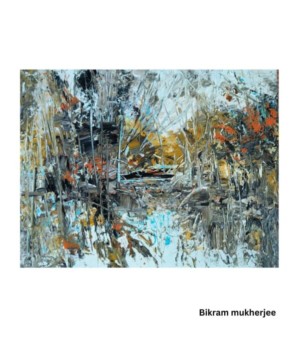 This expressive acrylic painting by Bikram Mukherjee captures the raw, unrestrained beauty of nature through bold knife strokes and textured layers of color. The composition draws the viewer into a dense, almost mystical woodland—where shades of blue, grey, and olive intertwine with bursts of ochre, orange, and soft yellows. Each stroke of the palette knife creates a rhythmic movement, echoing the wild harmony of a forest alive with energy and emotion.