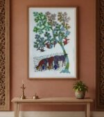 Bring the tranquility of the forest into your home with this authentic, handmade Gond painting. This 36×24 inch masterpiece features a colorful “Tree of Life” sheltering a herd of peacefully grazing deer. Every element is meticulously hand-painted using the traditional Gond technique of fine dots and lines.