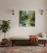 The application of paint is thick and dynamic, giving the foliage and water an immediate, tactile presence. The palette focuses on lush greens, soft yellows, and earthy browns, capturing the dappled sunlight and the reflections on the water’s surface. Whispers of white and pale blue effectively convey the movement of the stream and the bright clarity of the sky filtering through the dense canopy.