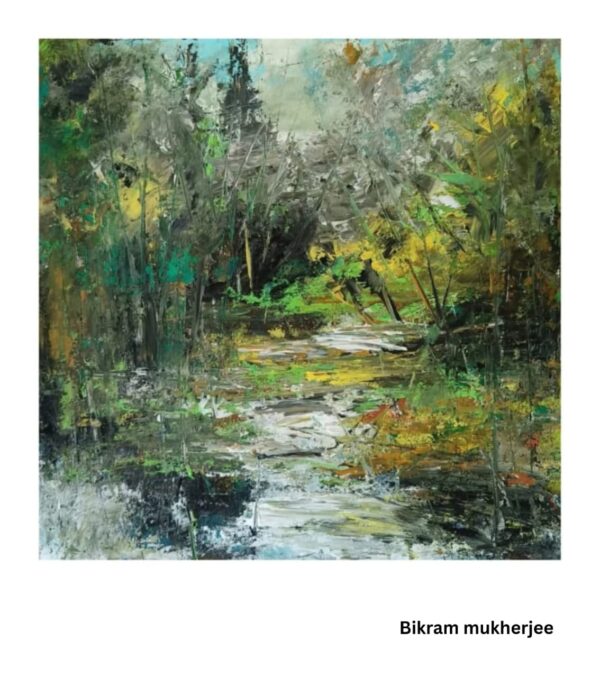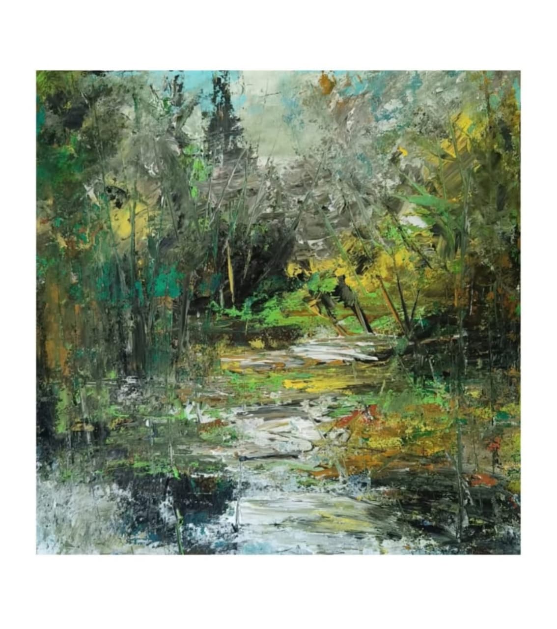 Riverbend Solitude is an expressive and intimate landscape painting created with acrylic on paper. The artist uses a powerful knife work technique to render a deeply textured and impressionistic view of a secluded forest stream or river bend.