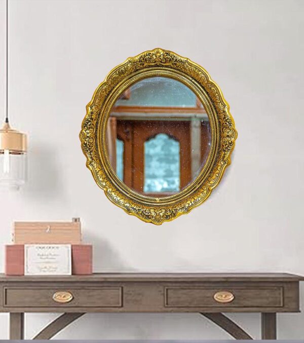 An exquisite oval mirror set in a finely crafted, antique-finish brass frame. With its intricate floral motifs and regal charm, this mirror is more than functional — it’s a statement of timeless elegance for your home. Perfect for hallways, living rooms, or as a luxury gift.