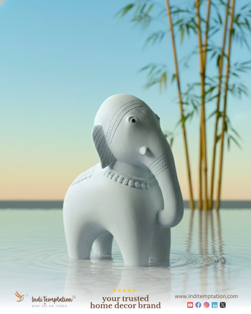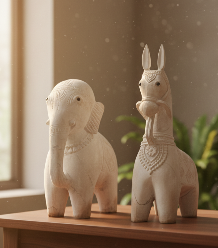 Enhance your décor with this majestic Elephant and Horse pair, a stunning Soapstone carving carved from authentic Odisha soapstone by traditional Odia artisans. This Soapstone carving features intricate tribal and folk motifs, symbolizing strength, wisdom, speed, and loyalty. Perfect for home entrances, gardens, temples, or as a thoughtful, unique gift.