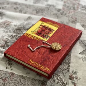 Handcrafted with textured orange handmade paper, this notebook is adorned with coiled jute art, earthy threadwork, and hand-painted sunburst motifs, accented with subtle mirror embellishments. A radiant fusion of rural craft and rustic charm, perfect for creative souls.