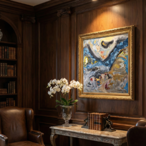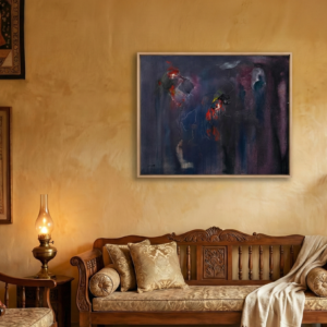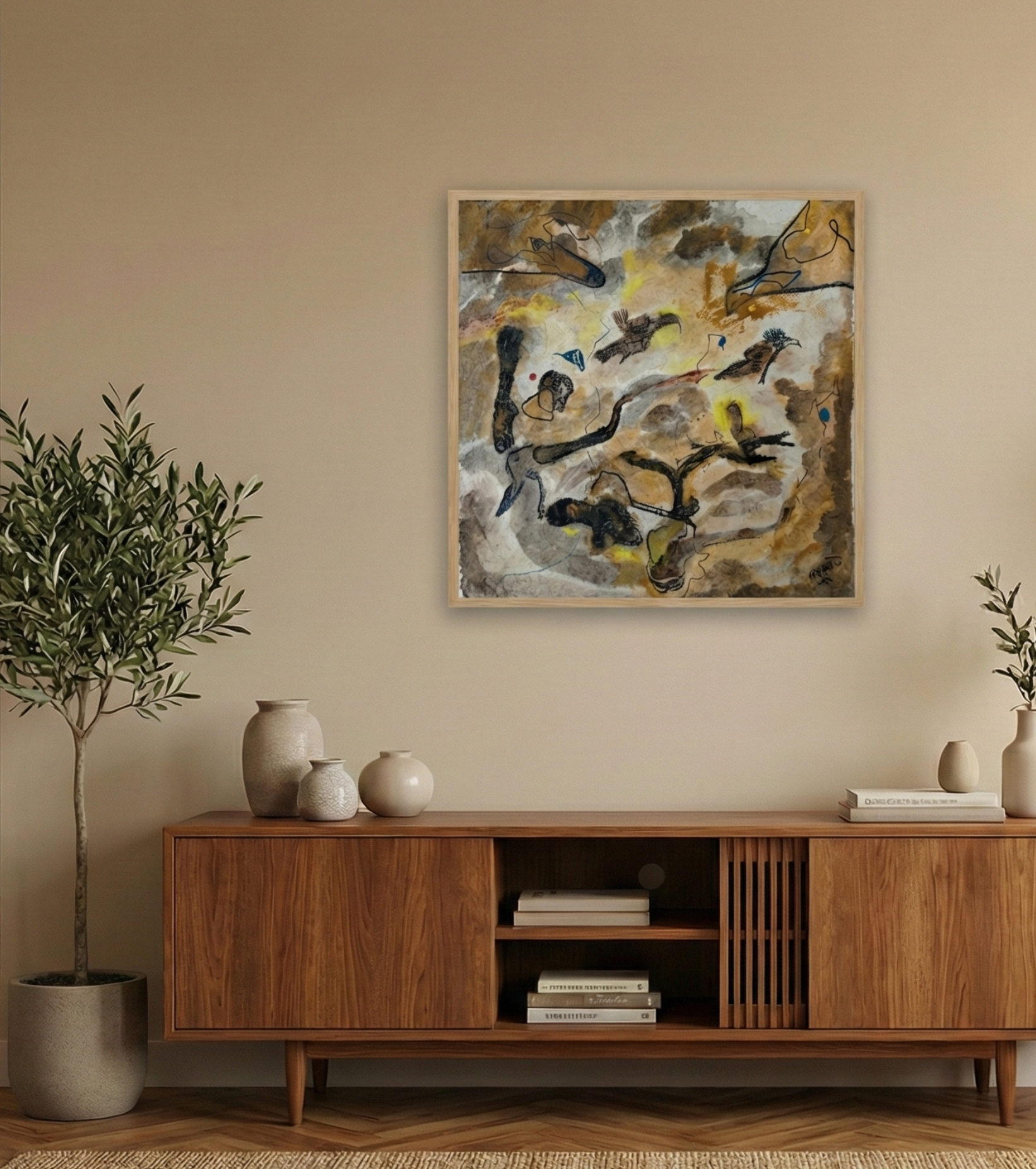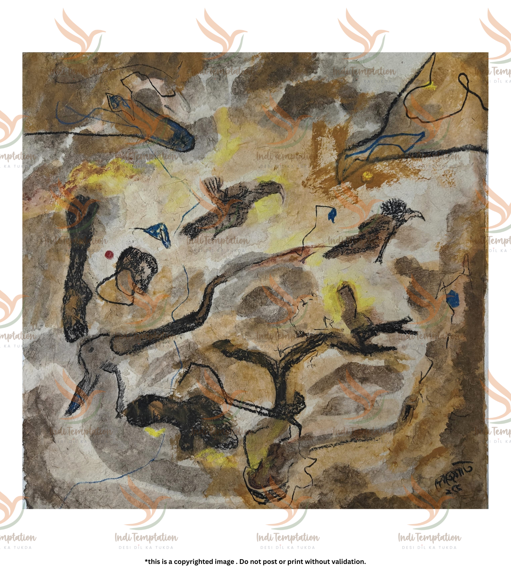 “THE BIRD” is a delicate yet evocative 51×51 cm mixed media work by Debojyoti Roy, executed on textured Nepali paper. This piece moves away from the artist’s heavier oil and acrylic works to explore fragility and flight through the transparency of watercolor and the tactile grit of pastel. The organic texture of the handmade paper becomes an integral part of the composition, interacting with washes of color to suggest a bird in motion—not as a static anatomical study, but as a fleeting essence of freedom and spirit.