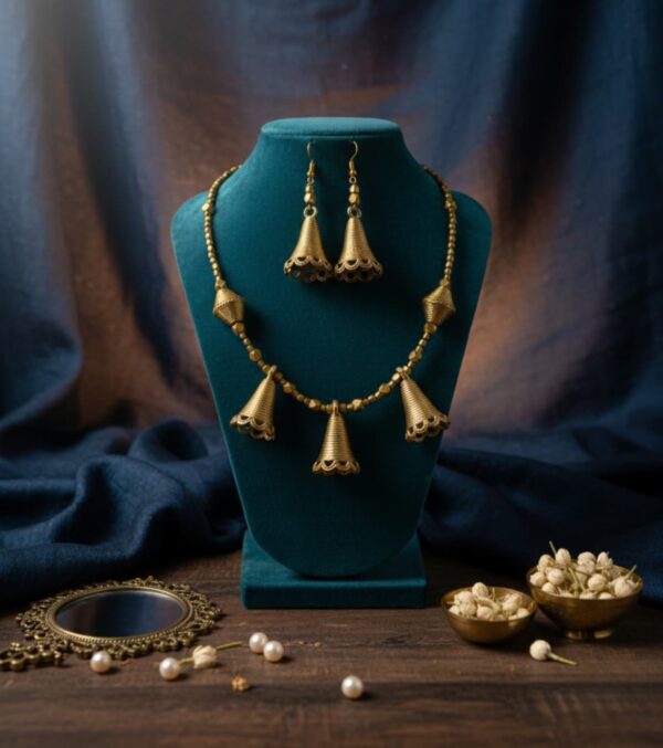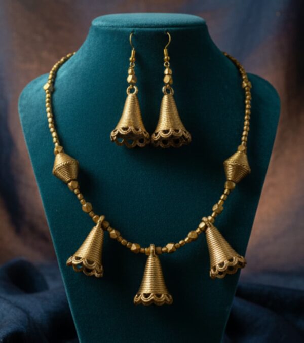 Coordinated Earrings: The set includes perfectly matched drop earrings featuring the iconic Dokra bell shape, hanging from a chain of small metal beads to complete the sophisticated look.