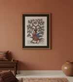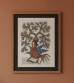 Enrich your collection with this unique, authentic handmade Gond painting, a captivating piece that beautifully merges nature and mythology. Gond art, a profound form of tribal folk painting from Central India, is renowned for its storytelling, intricate patterns, and vibrant color palette. It’s a tradition where the sacred meets the artistic, narrating the beliefs and connection to the forest life of the Gond community.