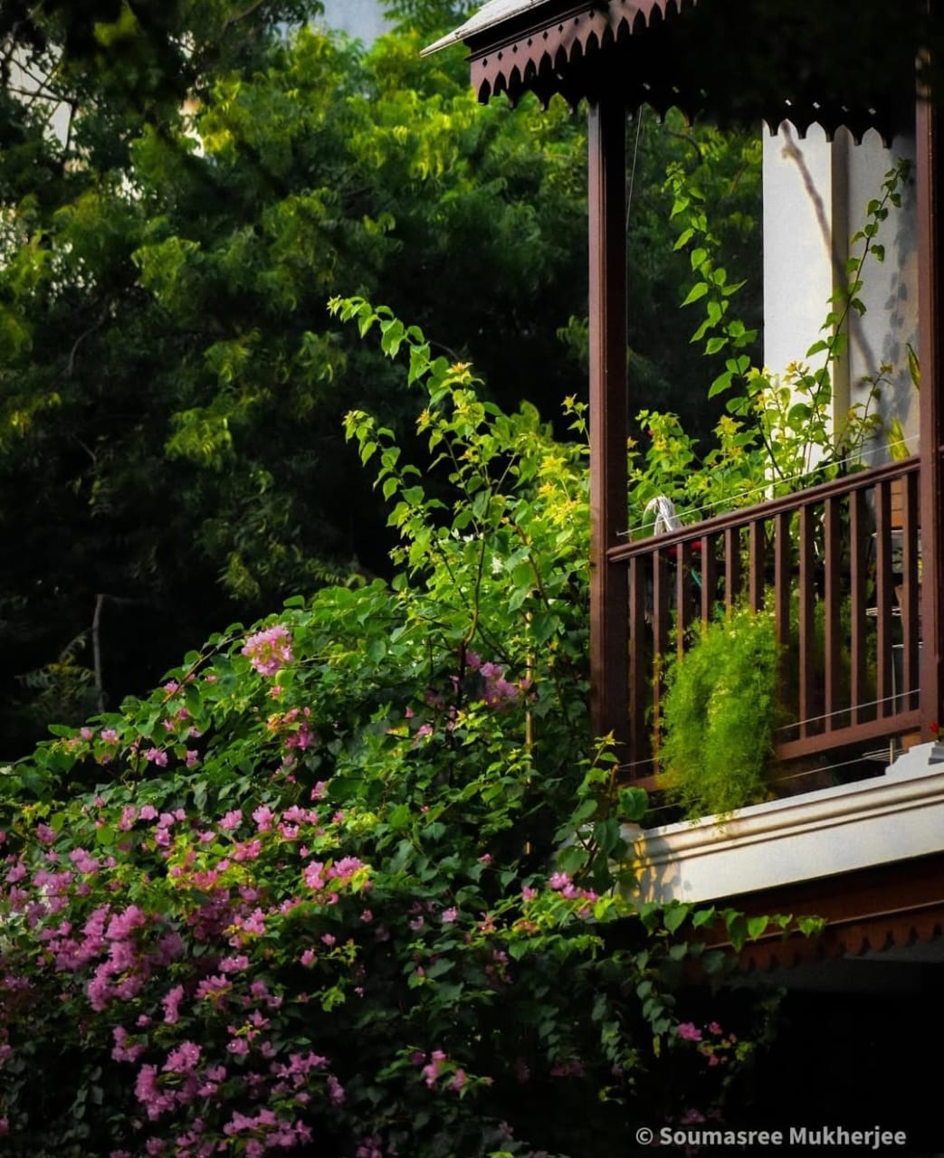 - A charming colonial-style balcony wrapped in lush bougainvillea and vibrant greens.
