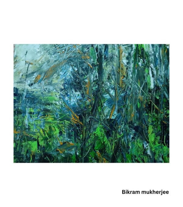 In Whispers of Green, Bikram Mukherjee captures the vibrant pulse of nature through dynamic knife strokes and a lush palette of greens, blues, and subtle violets. This expressive acrylic composition immerses the viewer in an abstracted landscape—alive with movement, light, and organic energy. The interplay of bold textures and layered hues evokes the sensation of sunlight filtering through dense foliage, where every stroke breathes with rhythm and vitality.