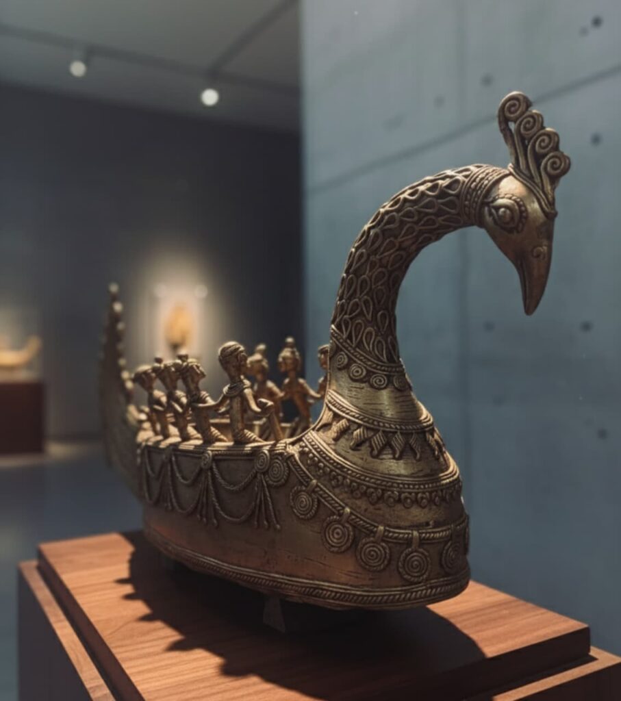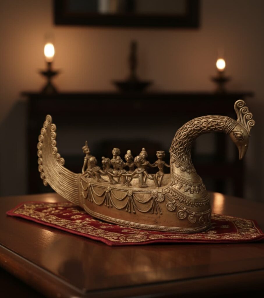 An extraordinary handmade brass Dokra sculpture featuring a majestic peacock boat carrying tribal figurines, symbolizing harmony and celebration. Measuring 9 inches in height and 20 inches in width, this elegant creation is a statement piece of heritage artistry and timeless luxury.