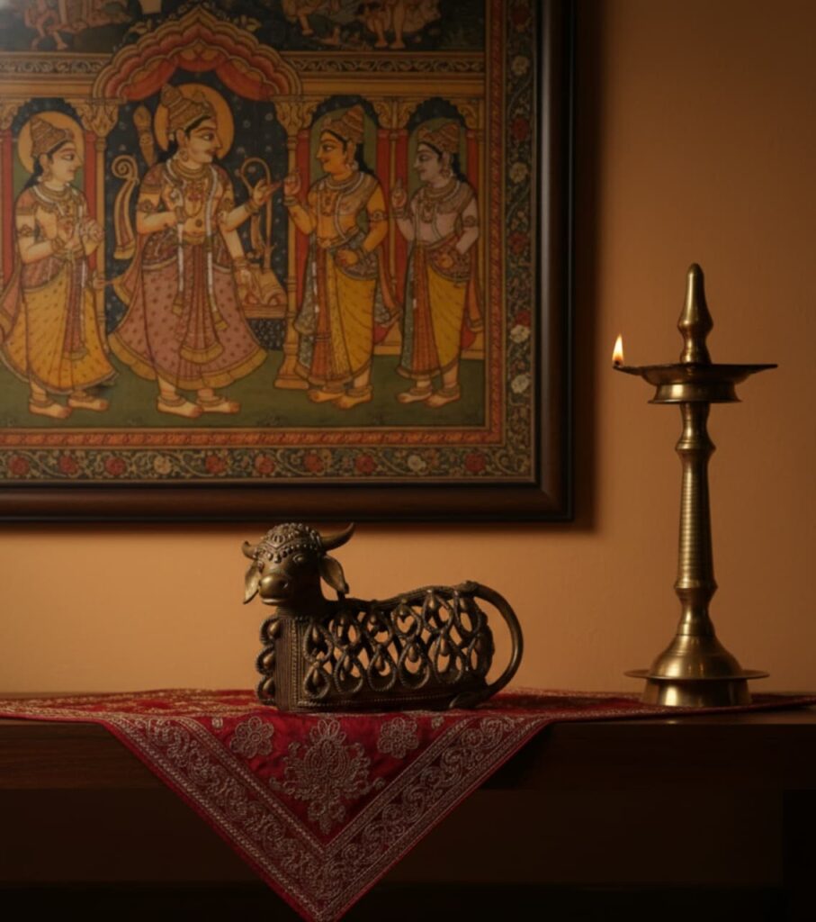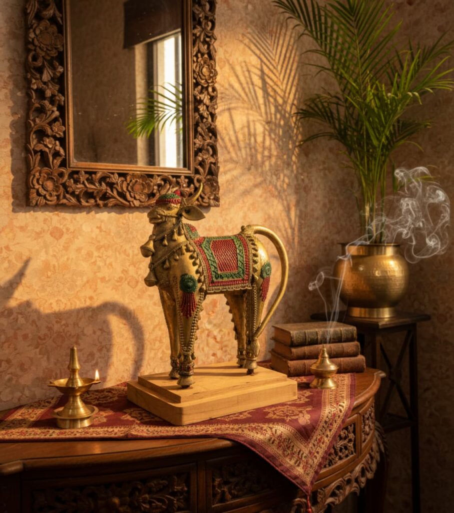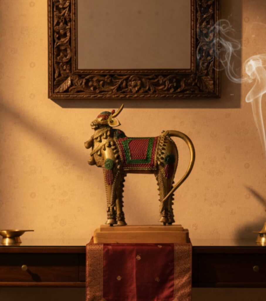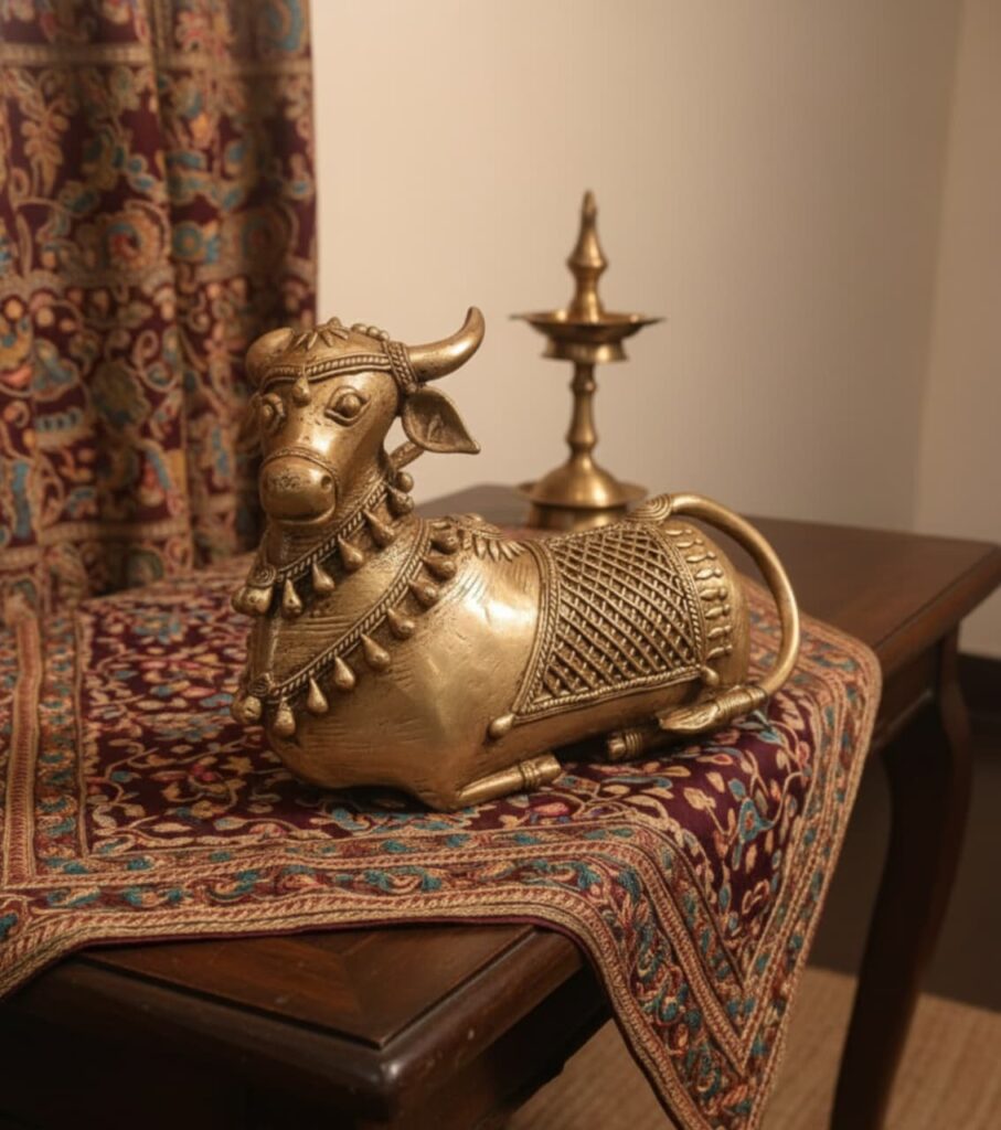 An authentic handmade brass Dokra Nandi sculpture that embodies sacred strength and divine grace. Crafted through India’s ancient lost-wax casting technique, this exquisite décor piece brings a timeless aura of spirituality and heritage to any space.