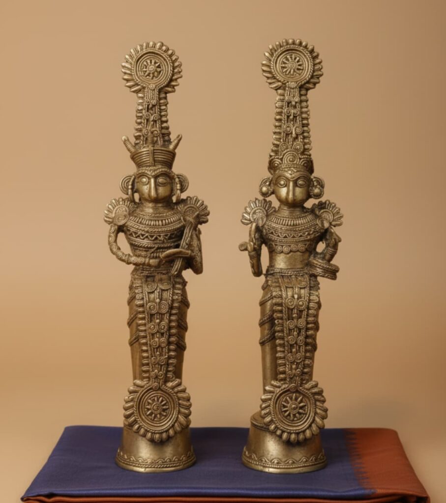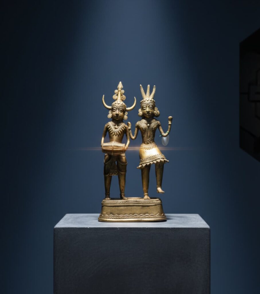 An elegant pair of handcrafted brass Dokra figurines depicting a tribal musician couple in rhythmic harmony. Standing 12 inches tall each, this artwork celebrates the spirit of tradition, unity, and artistry — a perfect blend of cultural charm and timeless craftsmanship.