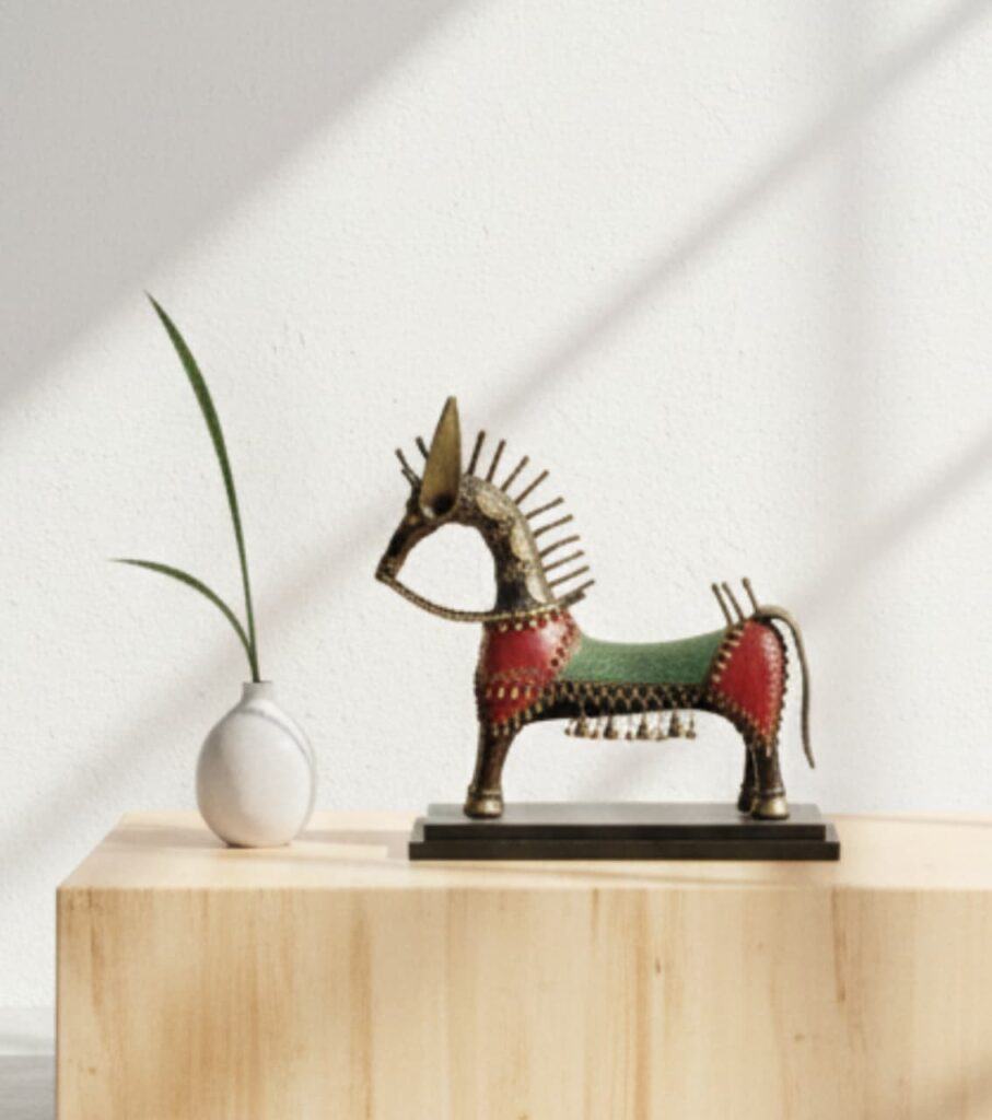 An exquisite handmade brass Dokra horse sculpture that celebrates India’s tribal artistry. Intricately detailed and richly finished, this authentic piece adds timeless elegance and cultural depth to any luxury interior space.