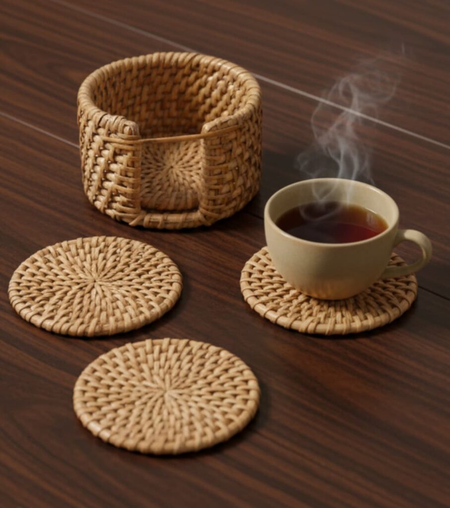 Handwoven Cane Coaster Set with Holder – Eco-Friendly Table Décor (Set of 6)