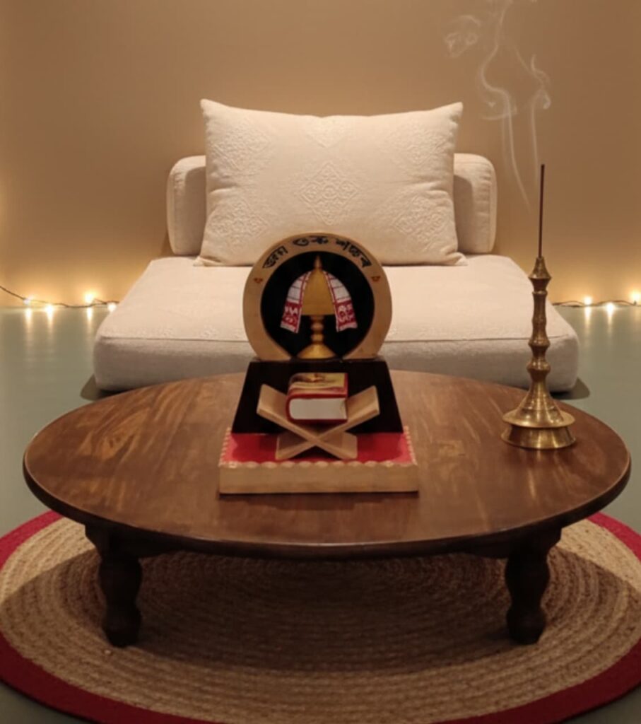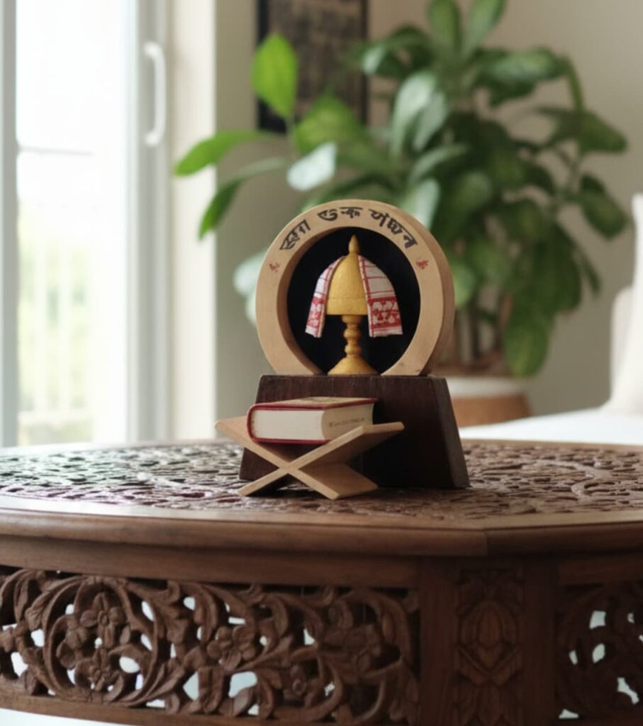 Celebrate Assamese culture and spirituality with this Memento Bhagwat Set, a beautifully handcrafted wooden piece symbolizing devotion and heritage. Featuring a miniature Bhagwat Gita placed atop a traditional Xorai (ceremonial offering stand) adorned with a Gamosa, this artifact makes an ideal spiritual décor, award memento, or cultural gift representing Assam’s deep-rooted traditions.