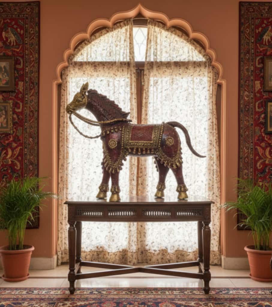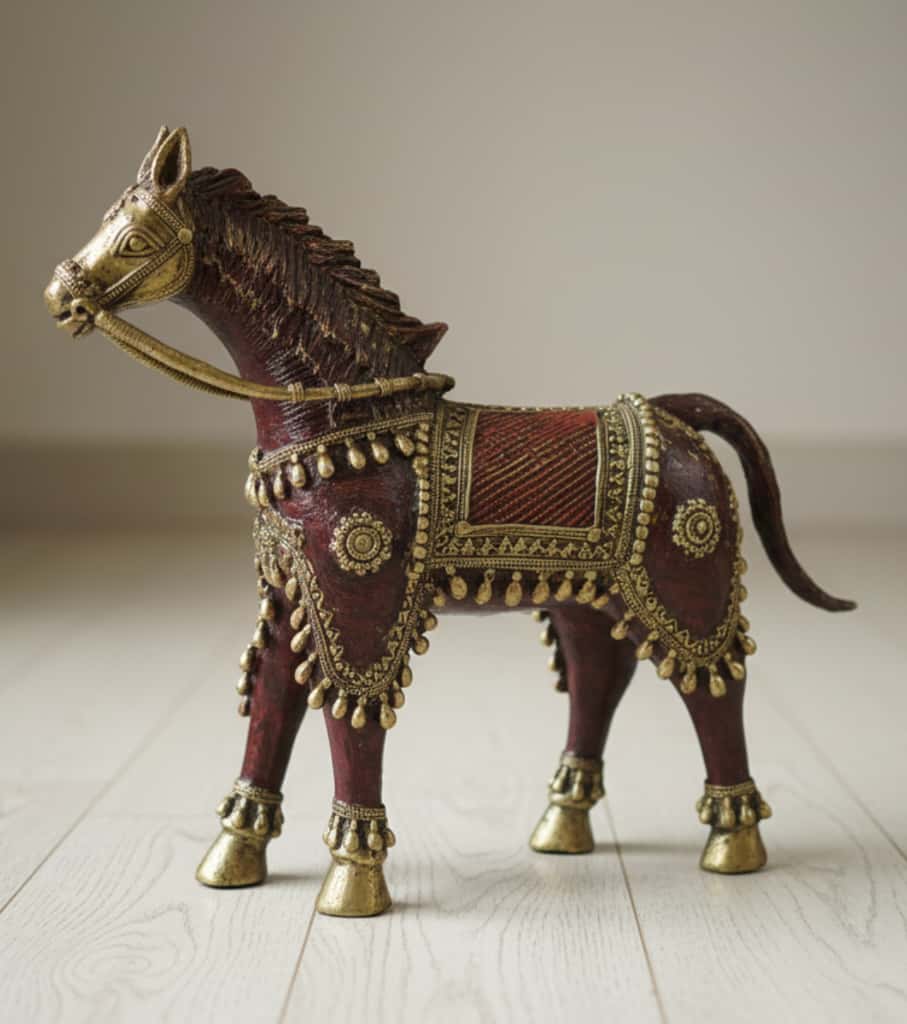 An exquisite handcrafted brass Dokra horse adorned with intricate tribal detailing and deep red enamel work. Measuring 14 inches in height and 18 inches in width, this regal piece embodies the grandeur of heritage artistry and the timeless grace of equine symbolism.