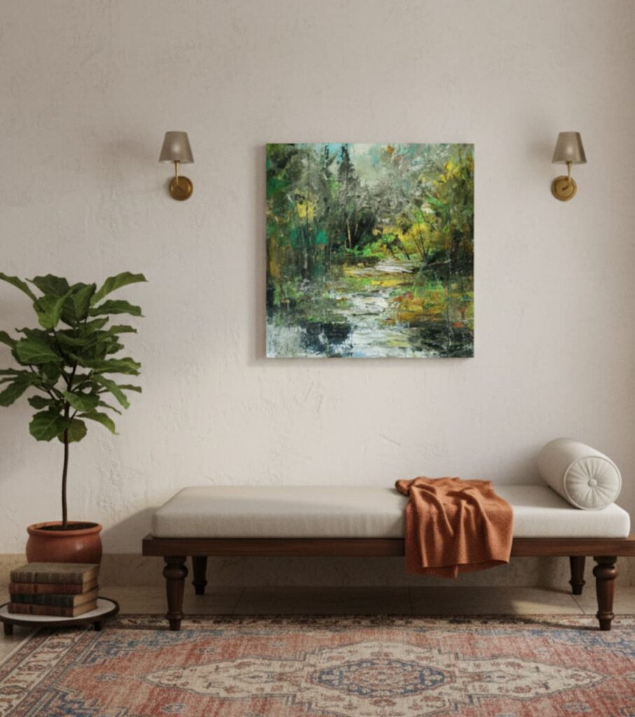 Description: Red Reverie is a powerful 14 x 18 inch mixed media painting on canvas by Rakhi Mukherjee, capturing the fluid movement of a woman in a vibrant red dress. With expressive strokes and minimalistic elegance, this artwork radiates freedom, femininity, and bold emotion—perfect for modern and eclectic spaces.