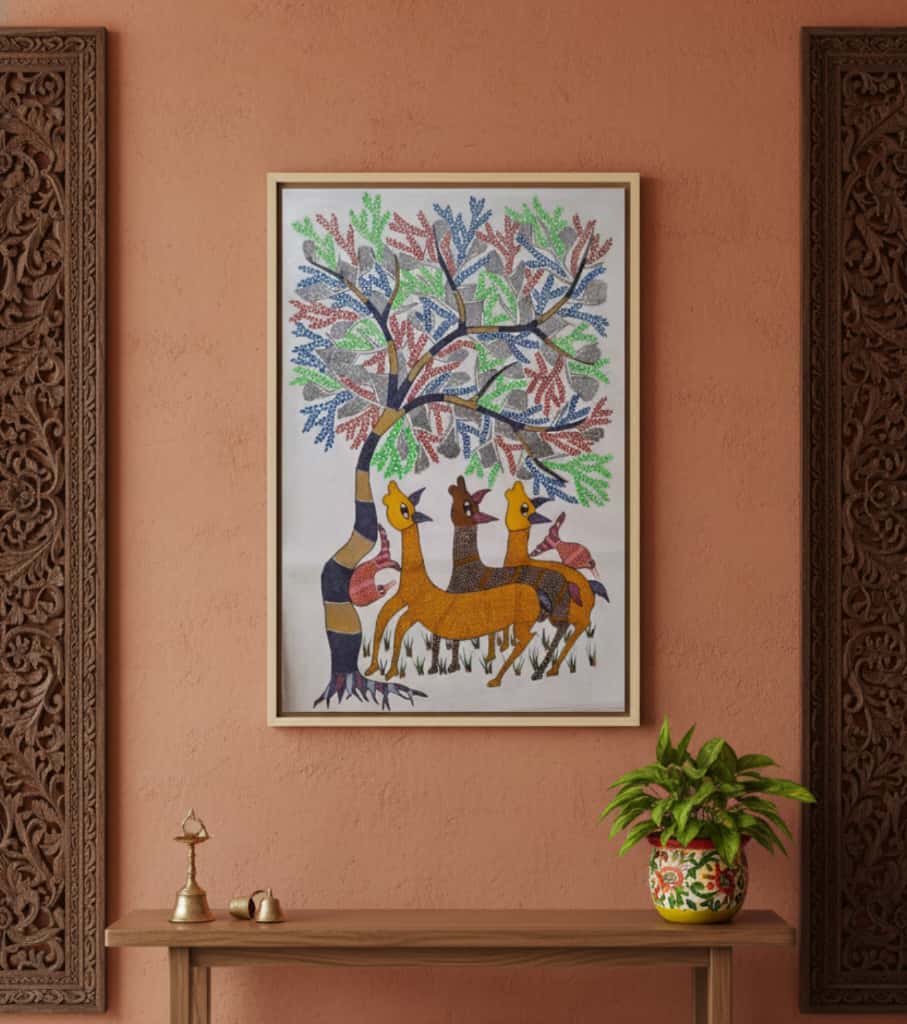 Authentic Handmade Gond Painting | 36×24 Inch Tribal Art with Deer & Tree Motif | Wall Decor (Without Frame)