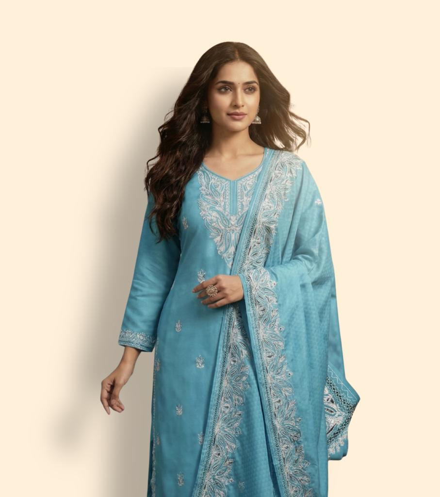 Step into effortless elegance with this breathtaking Sky Blue Suit Set. Crafted from luxurious silk-blend fabric and adorned with intricate white floral embroidery, this premium kurta set features a heavy-work dupatta perfect for weddings, festivals, and daytime events. Experience the perfect blend of traditional artistry and modern grace.