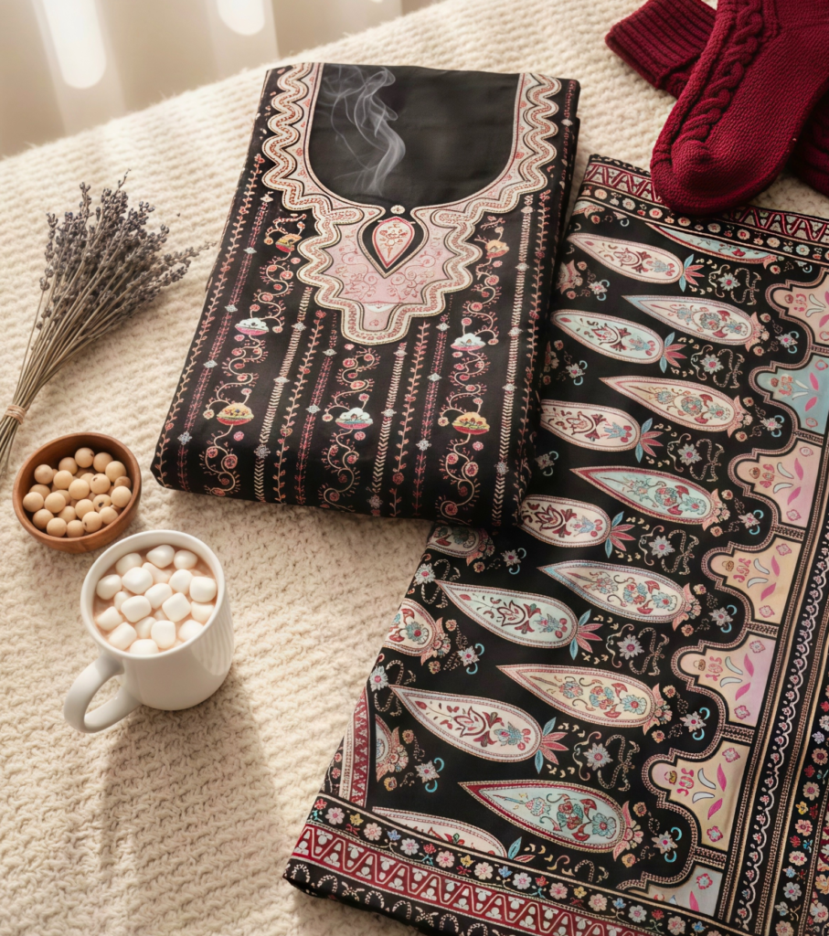 Step into the season with grace in this exquisite Black Winter Suit Set. Crafted from ultra-soft, warm fabric with a premium Pashmina feel, this unstitched ensemble features a stunning Kashmiri-inspired neckline and a majestic paisley-print shawl. A perfect blend of tradition and cozy luxury for office wear, winter gatherings, or casual outings.