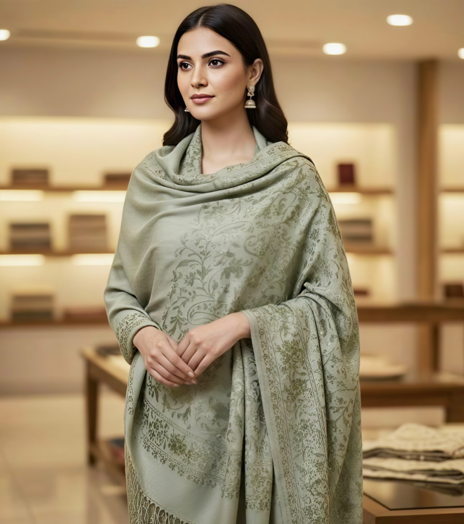 Wrap yourself in the understated luxury of our Sage Green Tonal Shawl. Meticulously crafted with a whisper-soft finish, this elegant wrap features intricate, self-colored floral motifs that evoke the timeless beauty of Kashmiri artistry. Whether paired with ethnic attire for a wedding or draped over a coat for a chic winter evening, this lightweight yet warm stole is the perfect accessory for the modern woman who values grace and comfort.