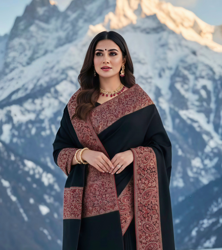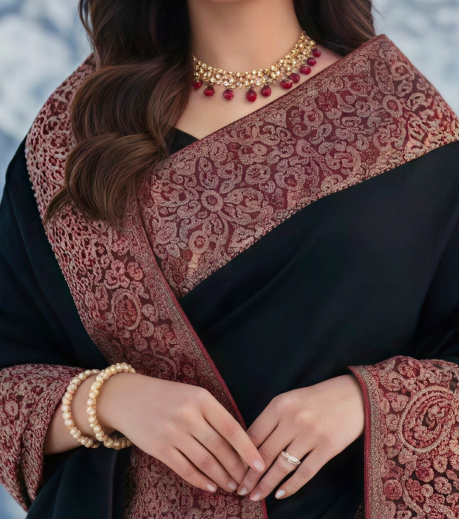 Step into timeless sophistication with this Luxurious Black Saree, accentuated by a magnificent maroon and gold paisley border. Inspired by the grandeur of Kashmiri Jamawar weaves, the dense floral detailing adds a layer of royalty to the classic black drape. A stunning choice for evening galas, receptions, and formal winter events.